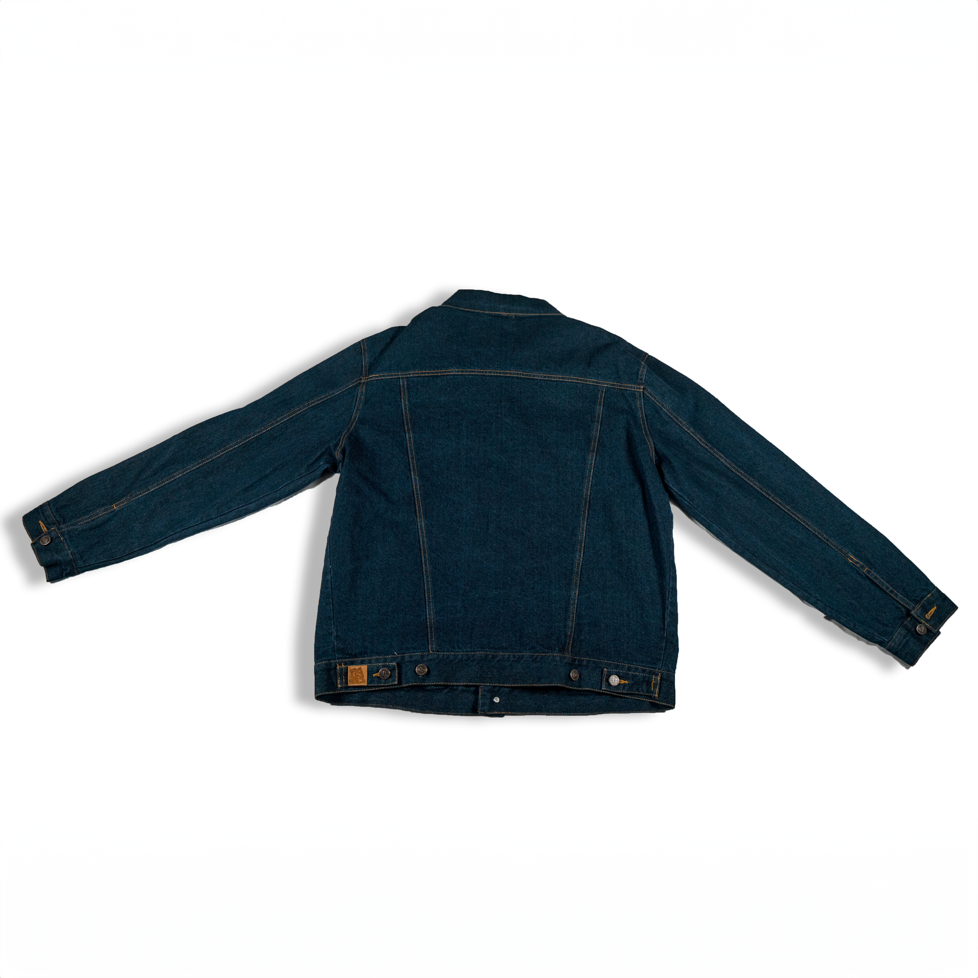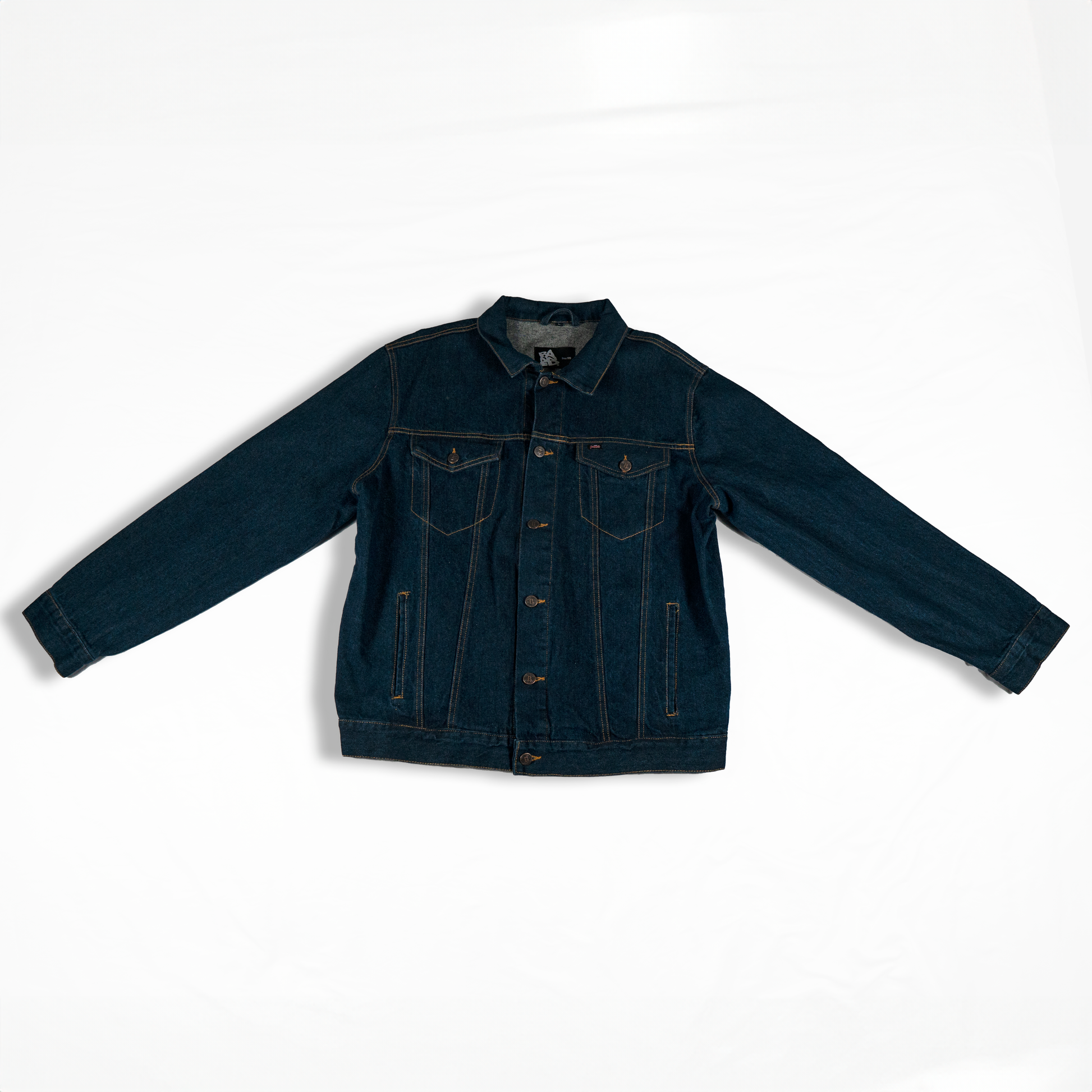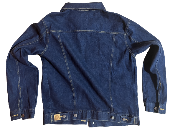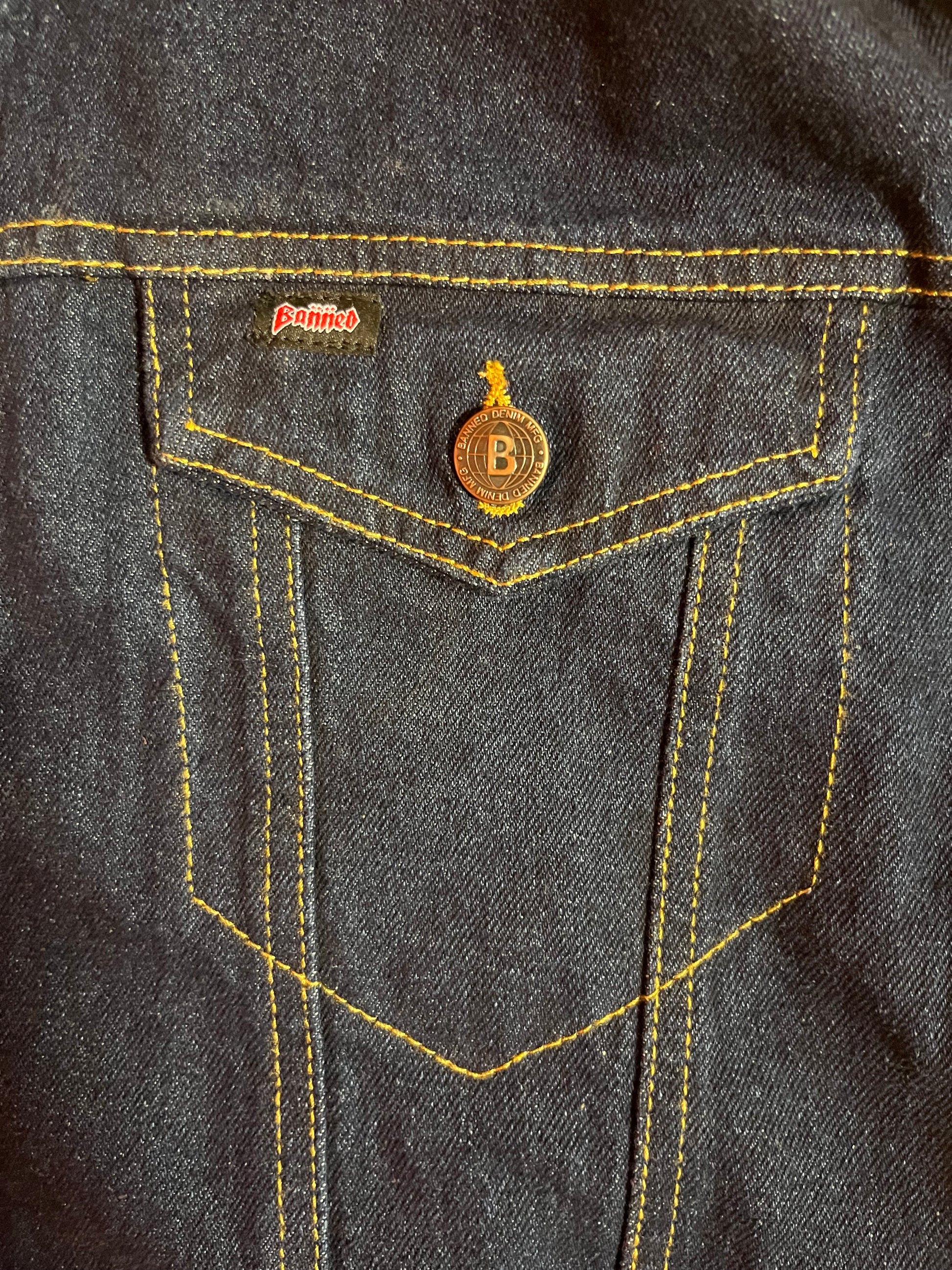 Blue denim jacket with custom BANNED buttons and stitched logos throughout