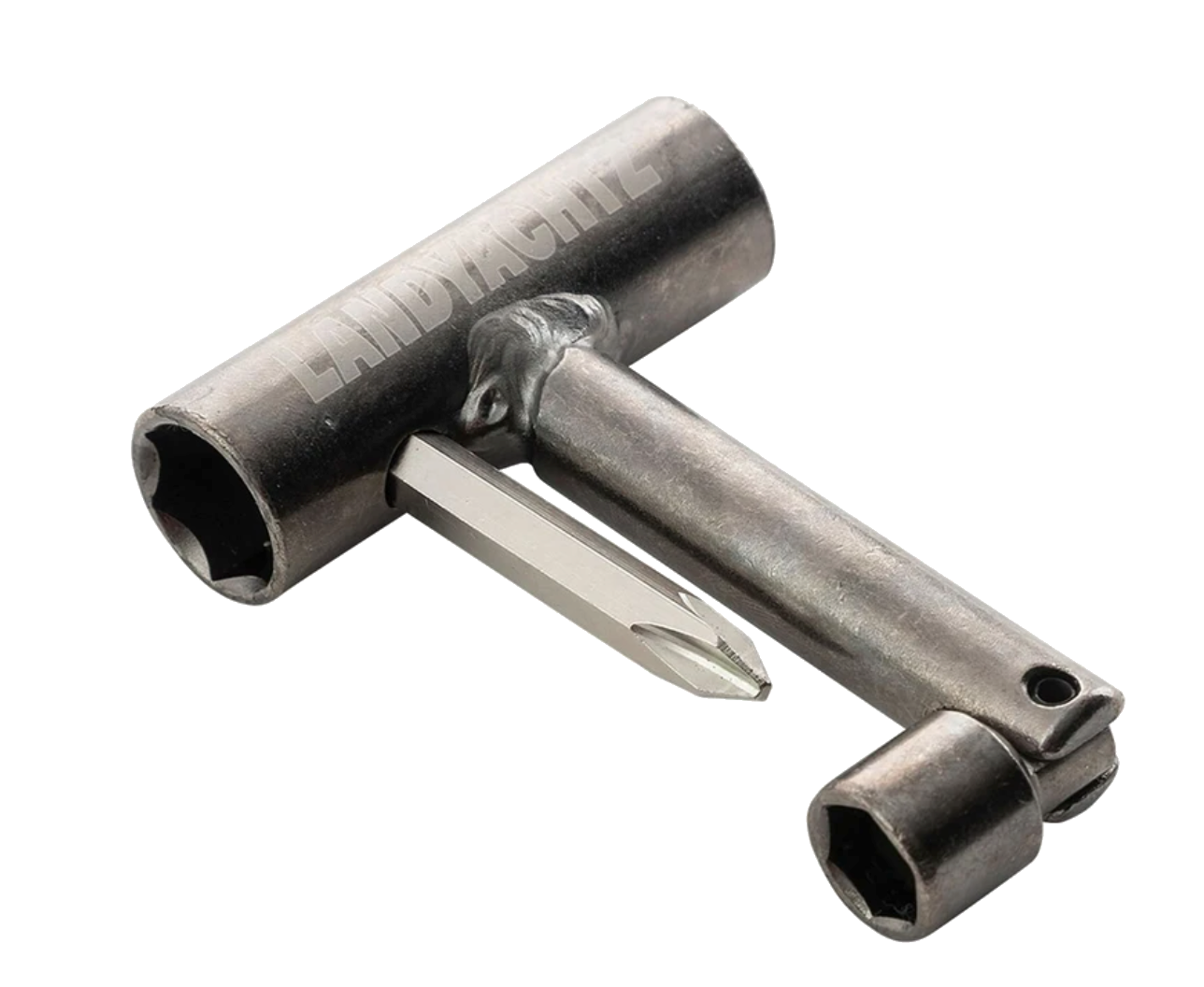 All the socket sizes and screwdriver/Allen key bits you will need to assemble and adjust your skateboard, all in a solid metal package for added durability. The articulating head allows you to get a solid grip on your nuts regardless of how tucked away they are.