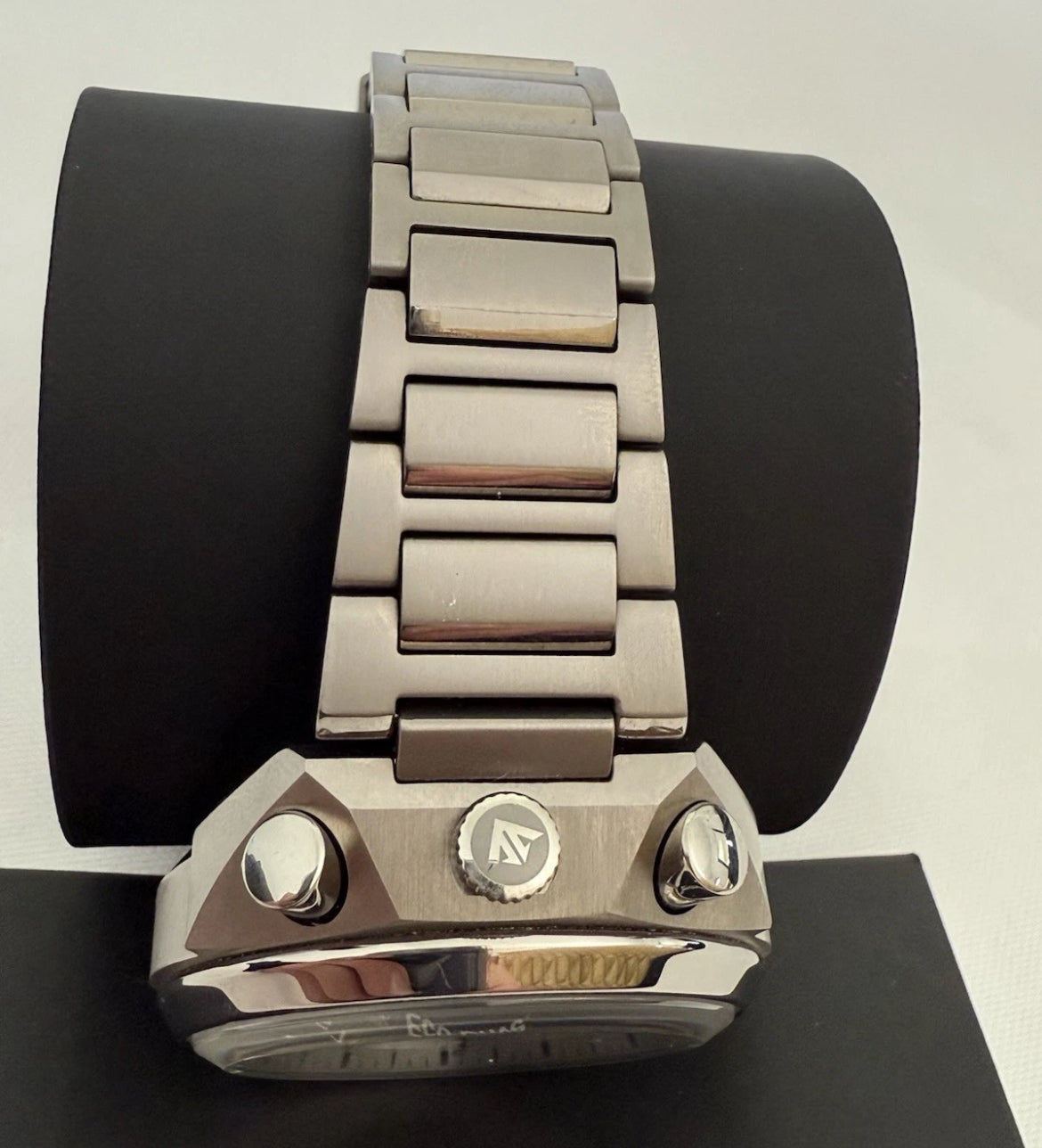 SUPER TITANIUM case, 43 mm diameter, 15.7 mm thick, with pushers and crown on the top of the case