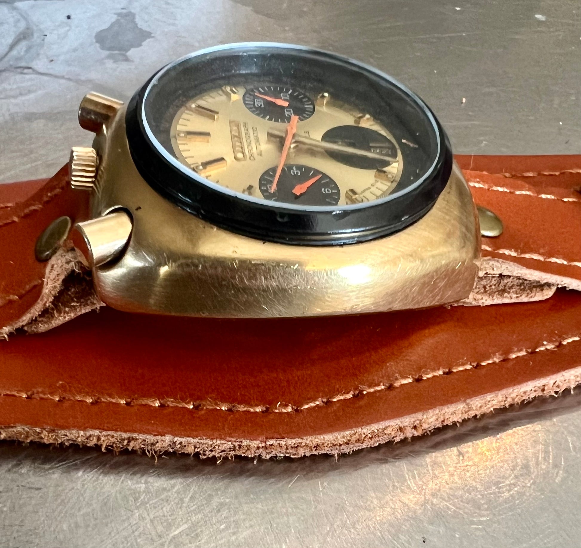 Gold plated, black face, leather strap not original