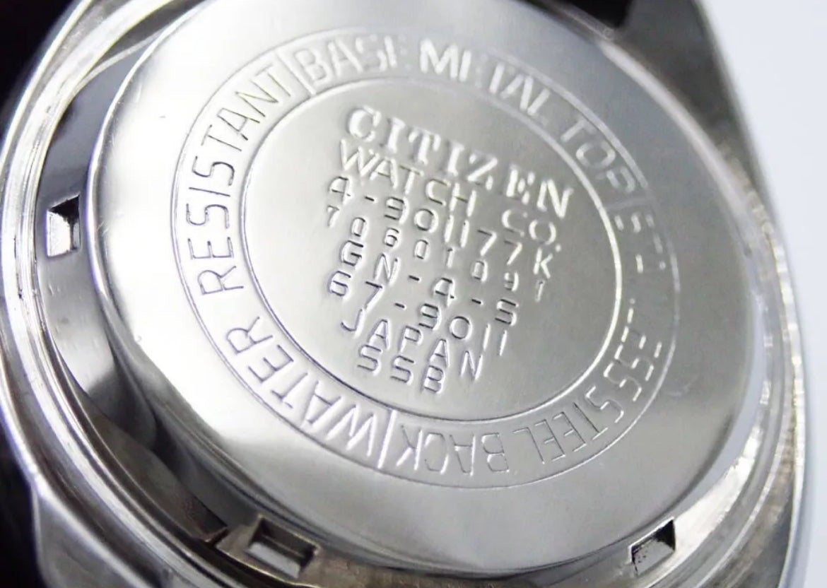 Back Case Marking -WATERRESISTANT BASE METAL TOP STAINLESS STEEL BACK CITIZEN WATCH CO. 4-901177K 70601091 GN-4-S 67-9011 JAPAN SSB