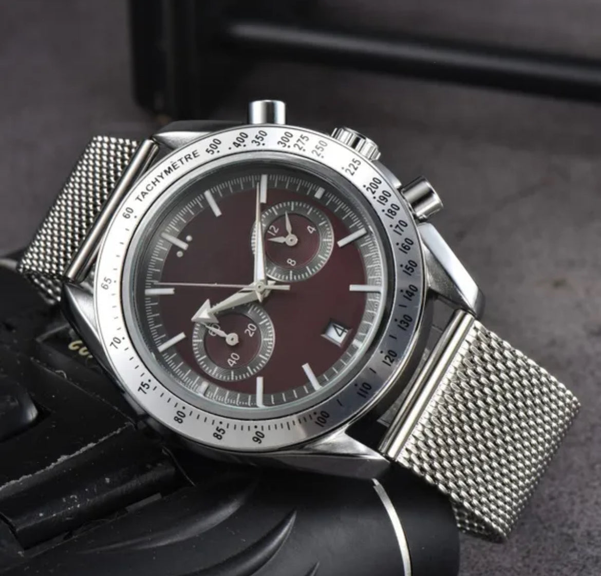 Luxury Speedmaster Maroon Dial Quartz Mov. Chronograph Stainless Steel Milanese Mesh Bracelet Watch