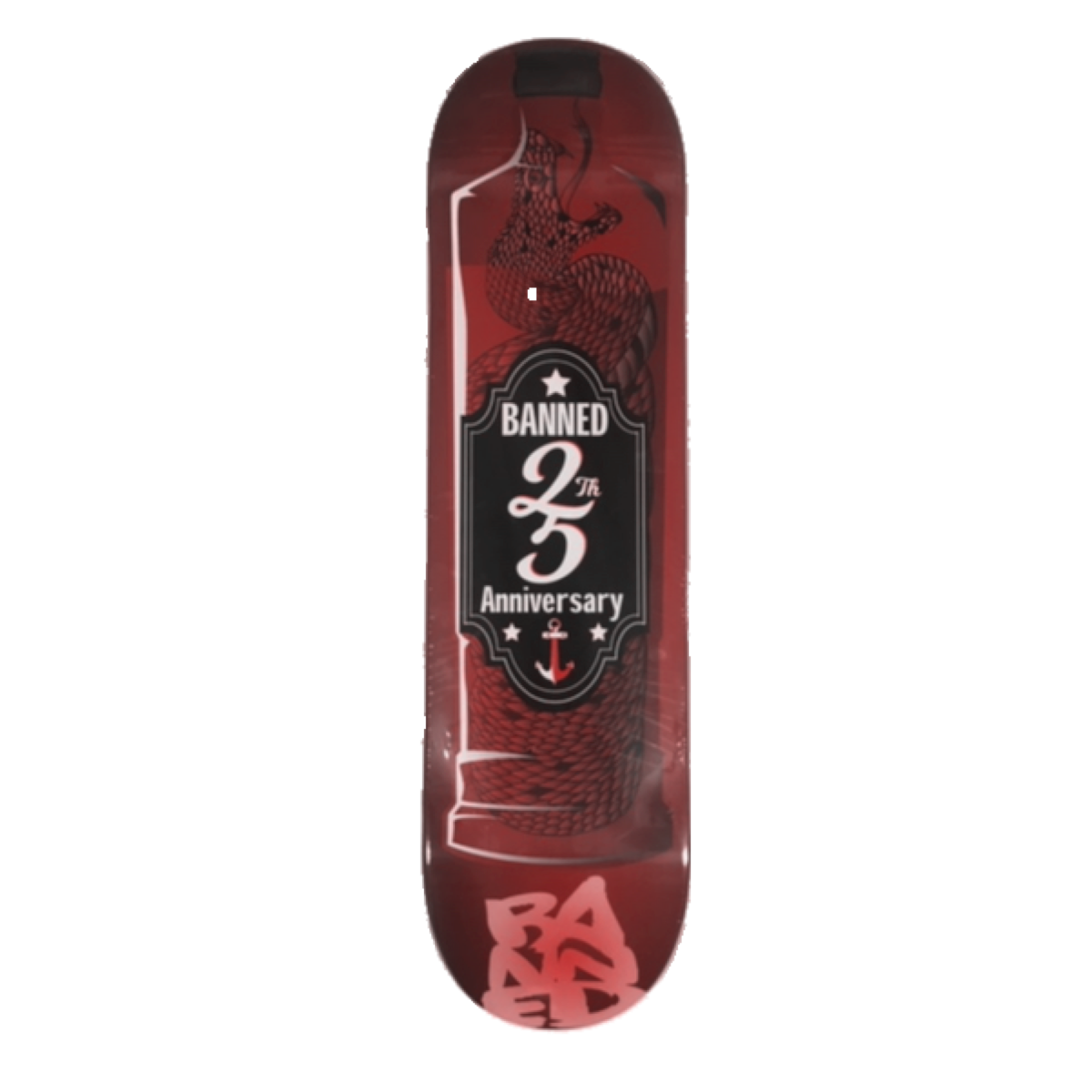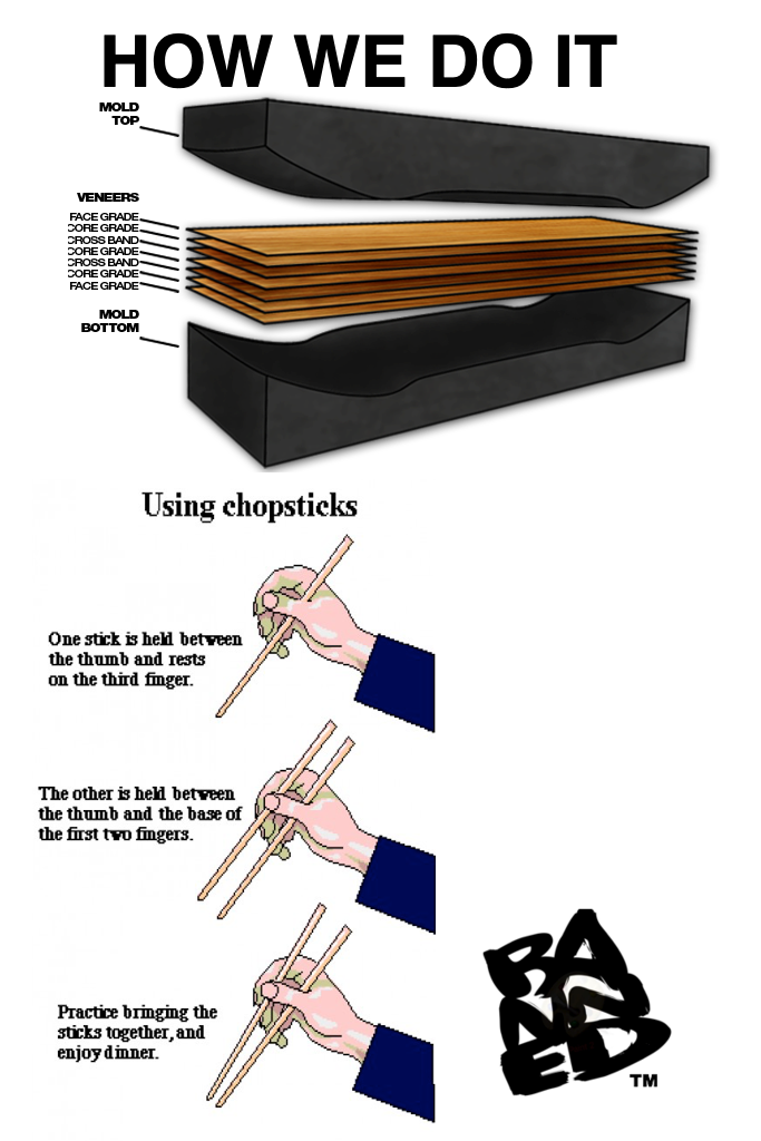 All BANNED skateboard decks are cold pressed. This method takes more time than a hot pressed deck but does not subject the wood to high temperatures that can weaken the wood fibers. The uncut decks are allowed to cure for 7 days in large stacks before finishing.