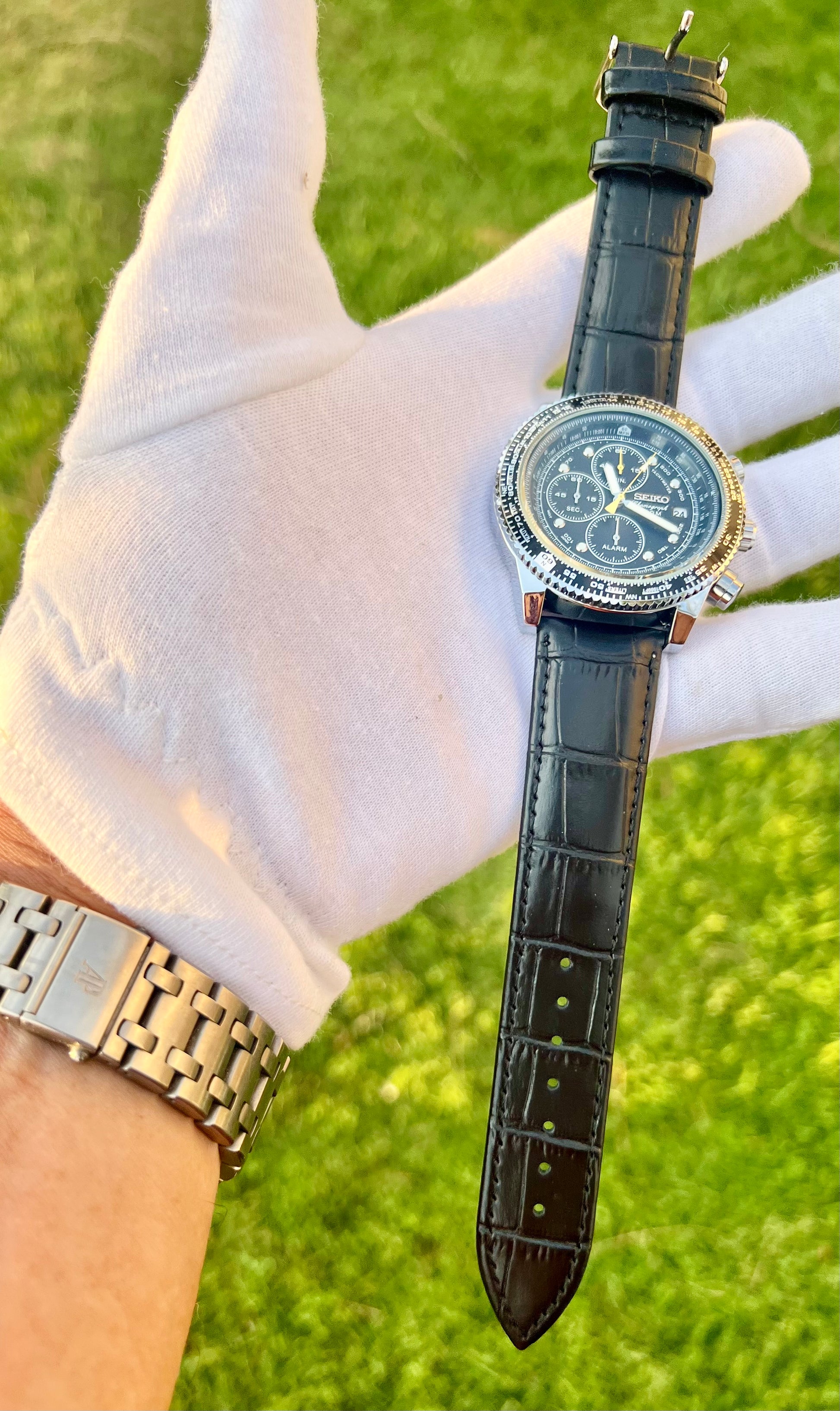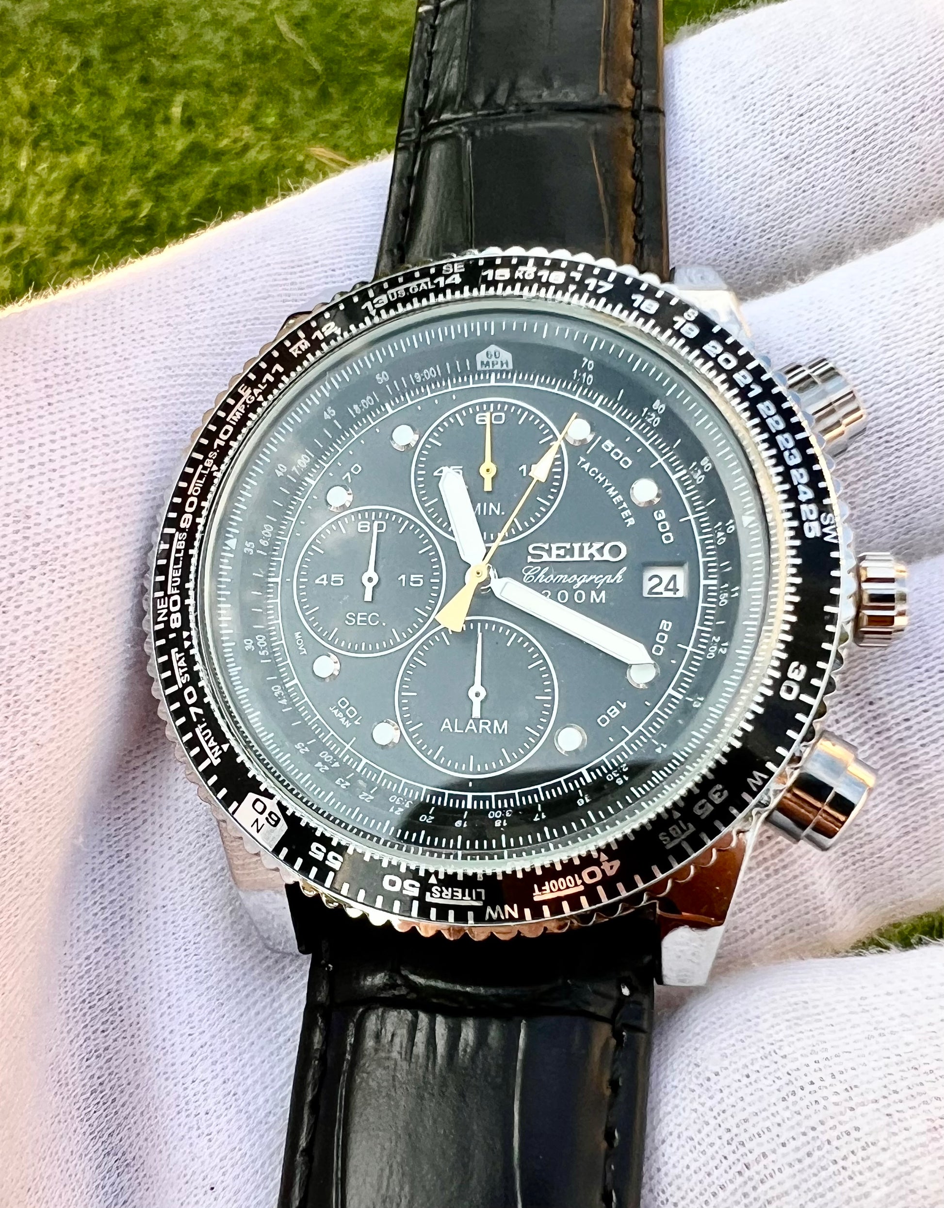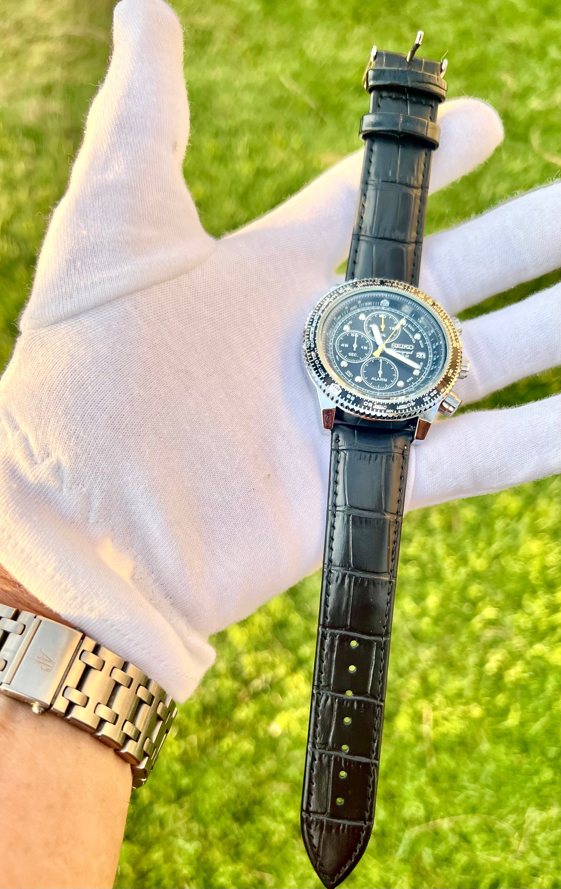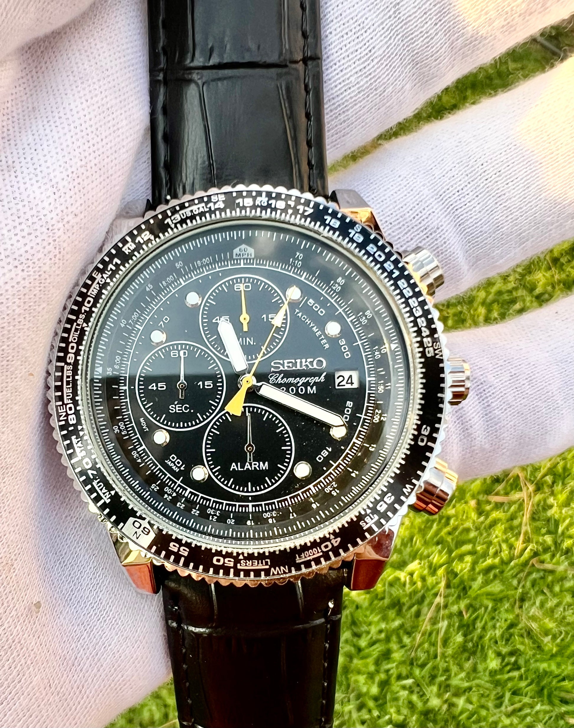 Seiko Chronograph Speedtimer 43mm Quartz Movement Black Dial Bezel Leather Watch