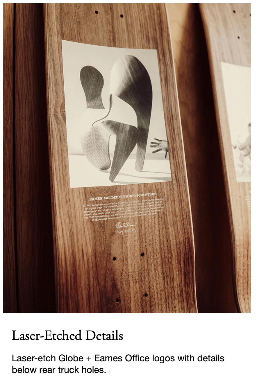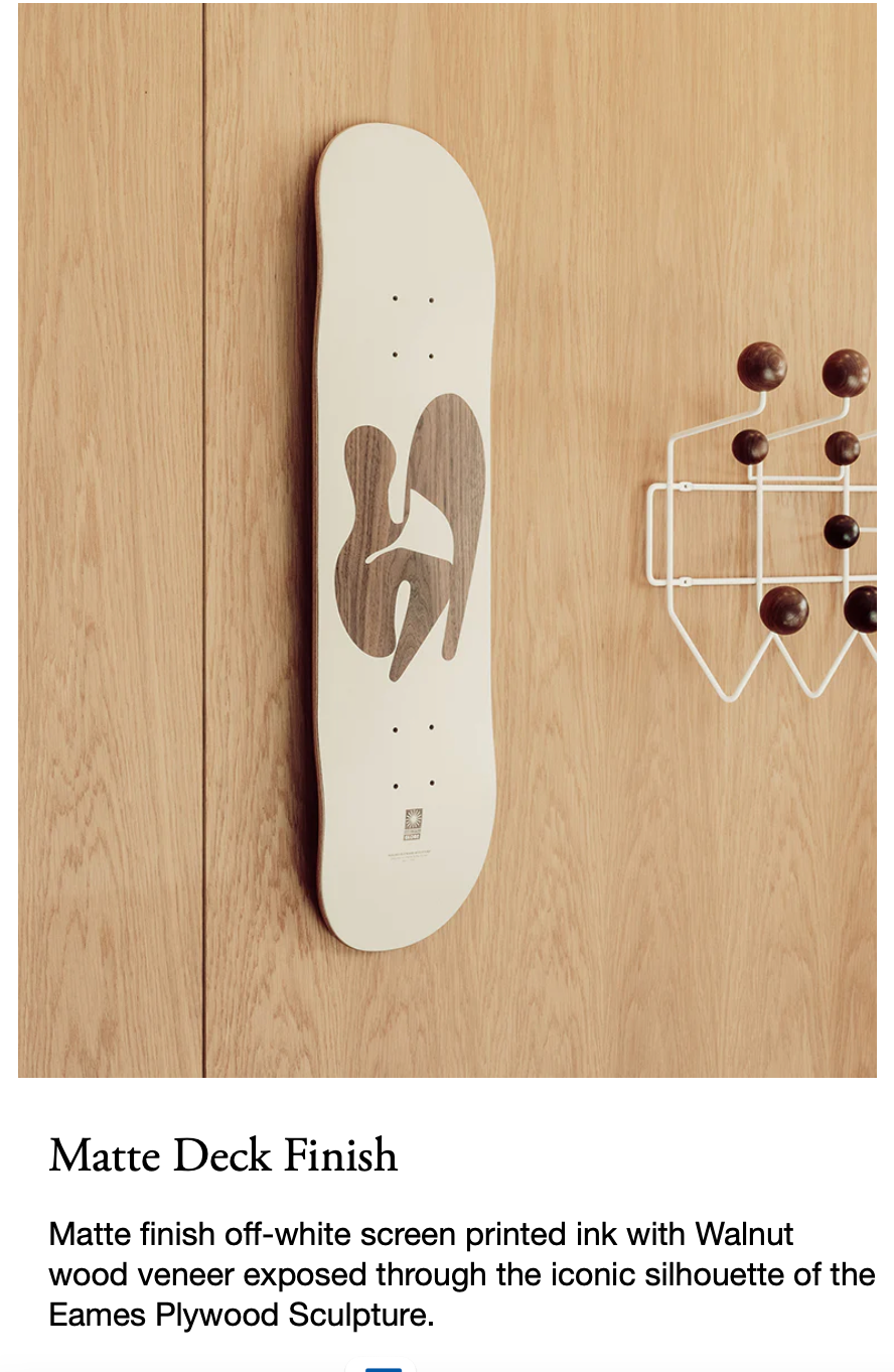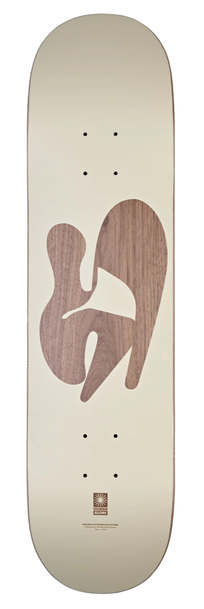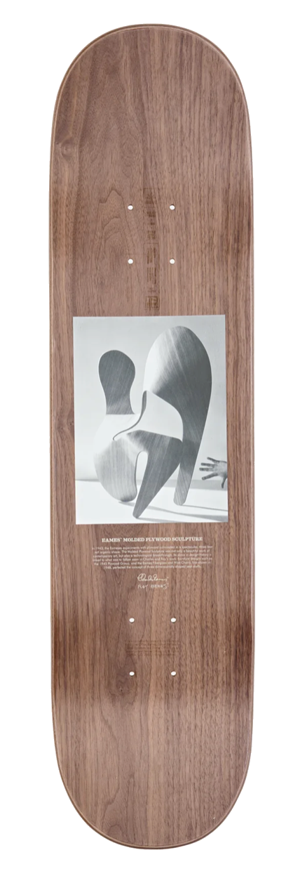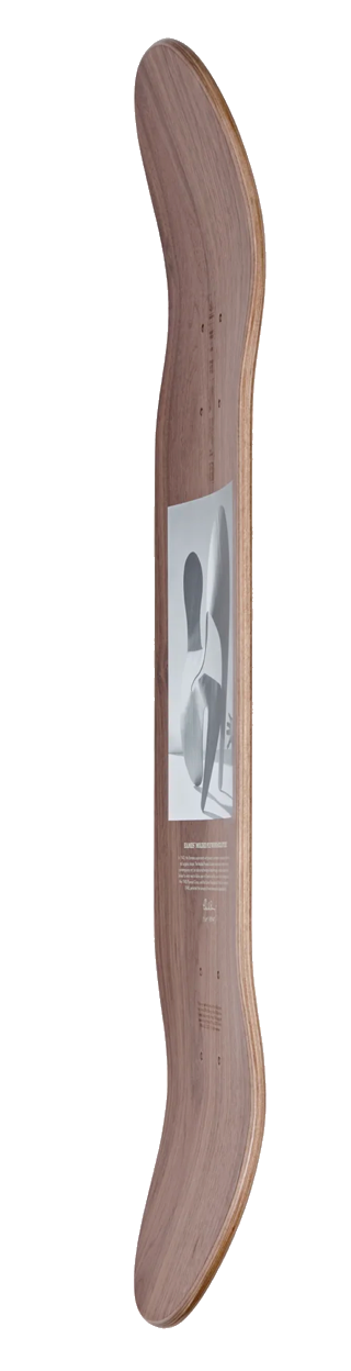 Specialty Walnut veneer decks featuring iconic art extending the legacy of Charles and Ray Eames. The Eames Silhouette 8 in Plywood Sculpture features Full concave and is constructed from Walnut + Resin-7 Canadian maple. The top of this 8.0” walnut and Canadian maple deck features the story behind the Eames “Molded Plywood Sculpture”, designed by Ray Eames, 1943. These decks are individually boxed, and include wall hangers for easy mounting.