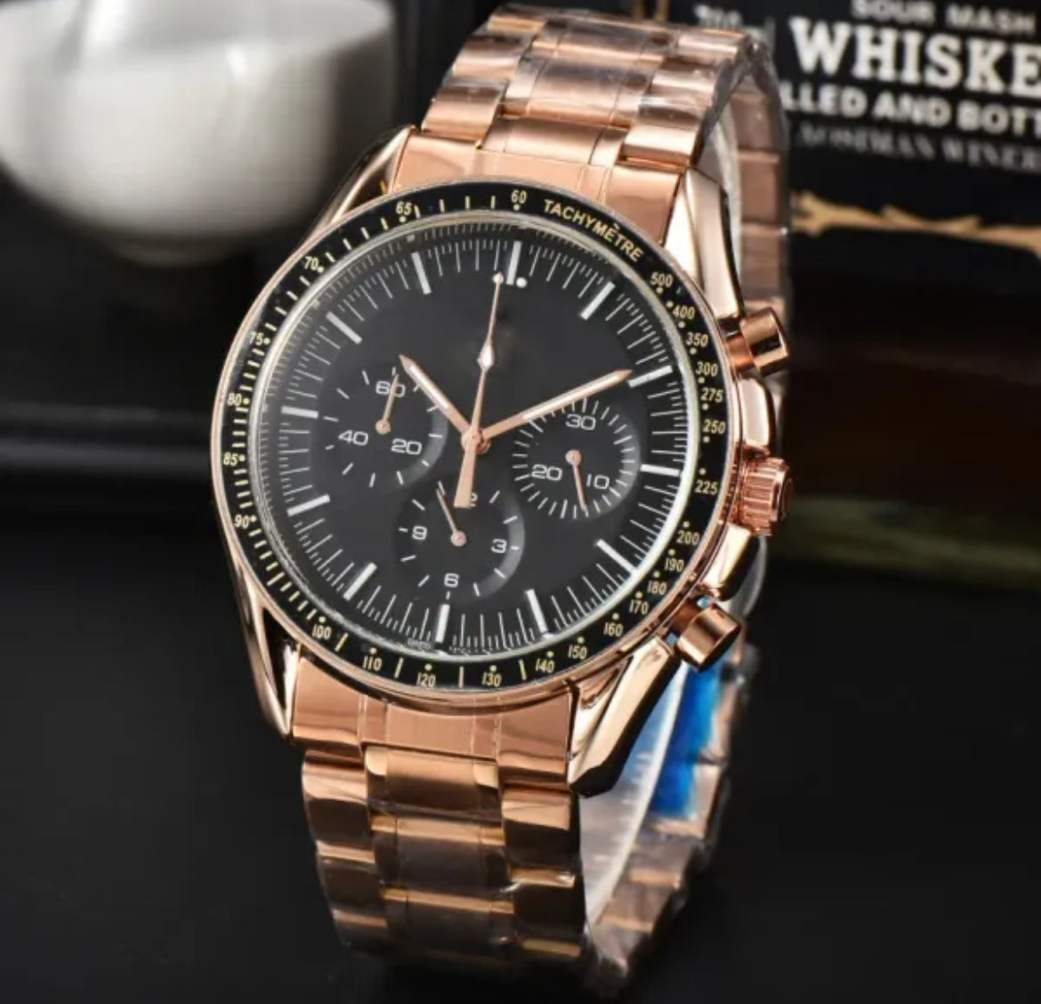 Luxury Speedmaster All gold tone Black Dial Quartz Movement Stainless Steel Bracelet Watch