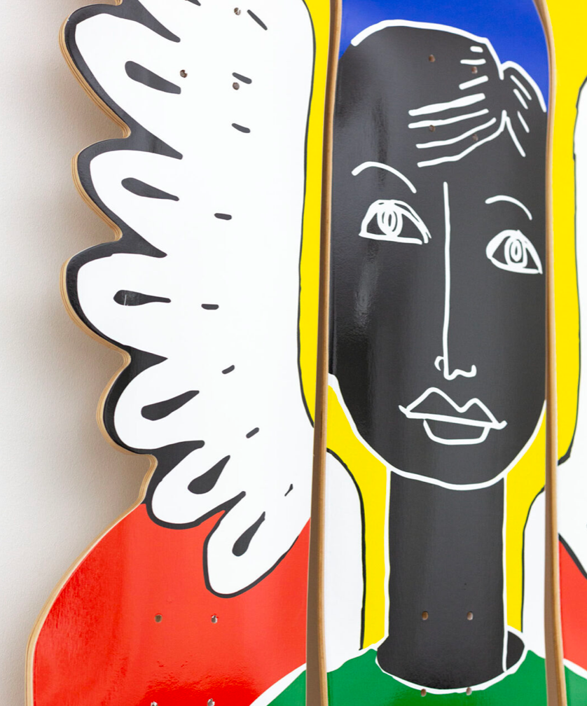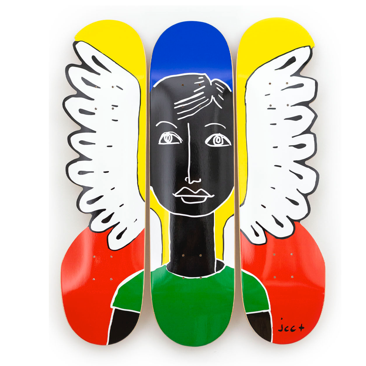 The limited-edition triptych pays tribute to the temerity of skateboarders and their fierce desire to rise and fly over the asphalt. By drawing the cut-out guardian angel, Jean-Charles DE CASTELBAJAC thought of these everyday heroes, their chivalrous community born in the heart of electric cities and the eternal youth of the daring. The edition was created to give wings to all these conquerors and inspire skateboarders of the future.