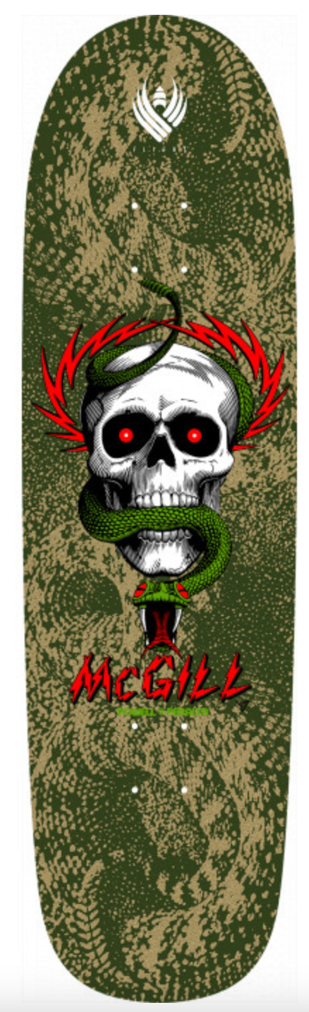 Just as Mike McGill was perfecting the 540 McTwist in the summer of 1984 at Swedish summer camp, V.C.J. was working on a new deck graphic for him. Since the "Skull & Bones" theme was proving to be popular, that was the direction chosen for McGill's new deck. Mike's input was to add the snake and lightning bolts since there is an abundance of both in his home state of Florida. McGill's Skull & Snake is truly a classic skateboard icon.