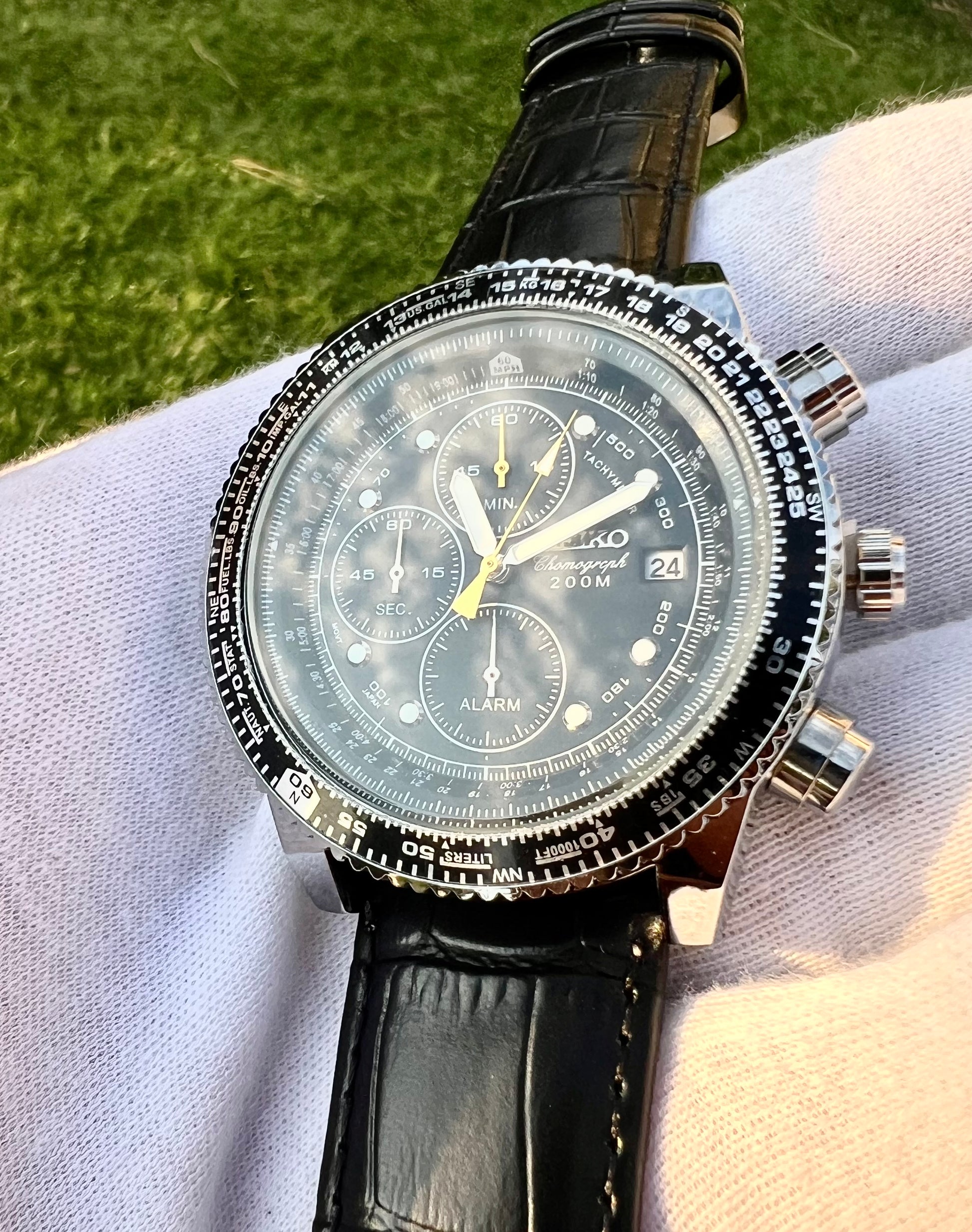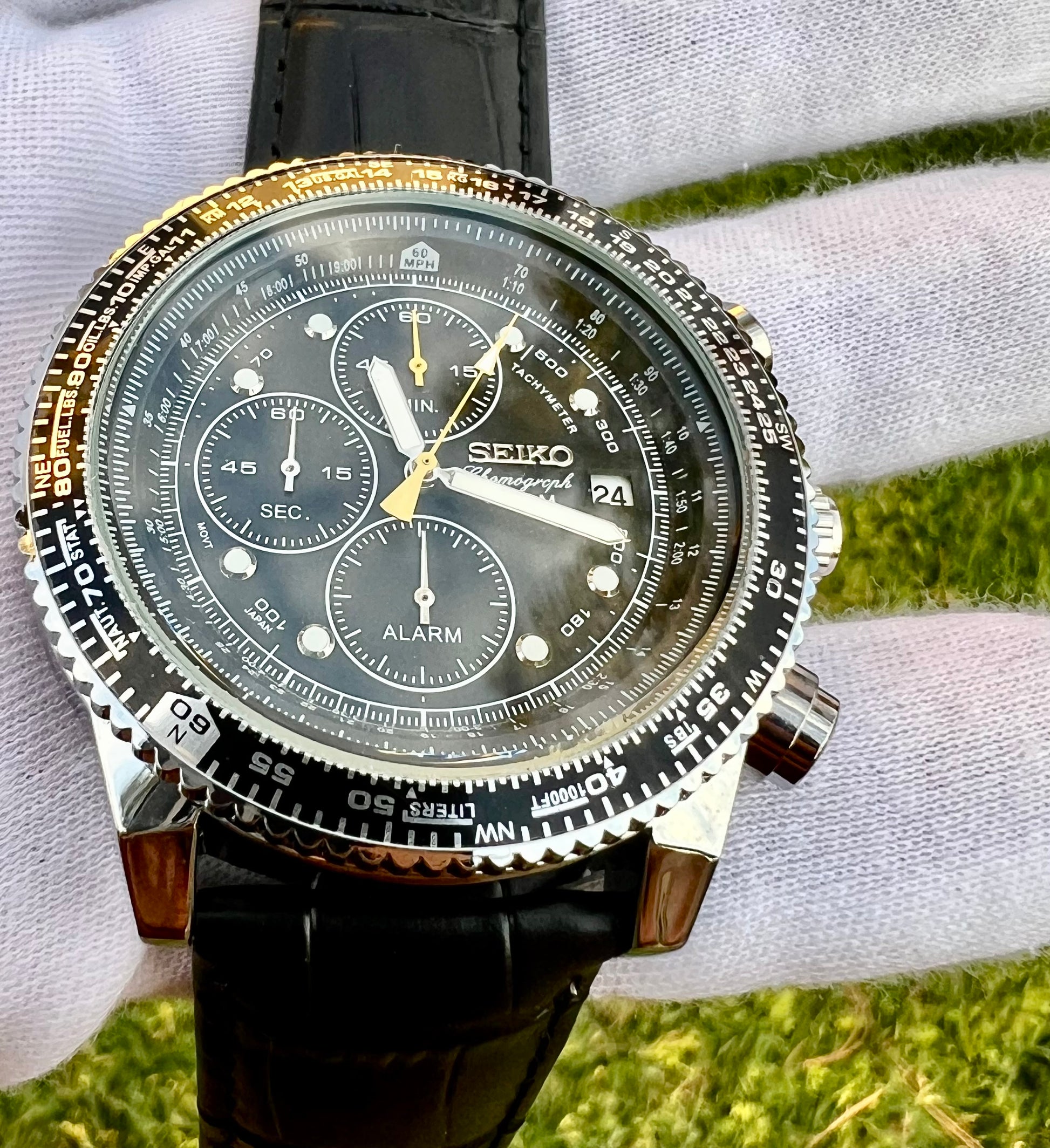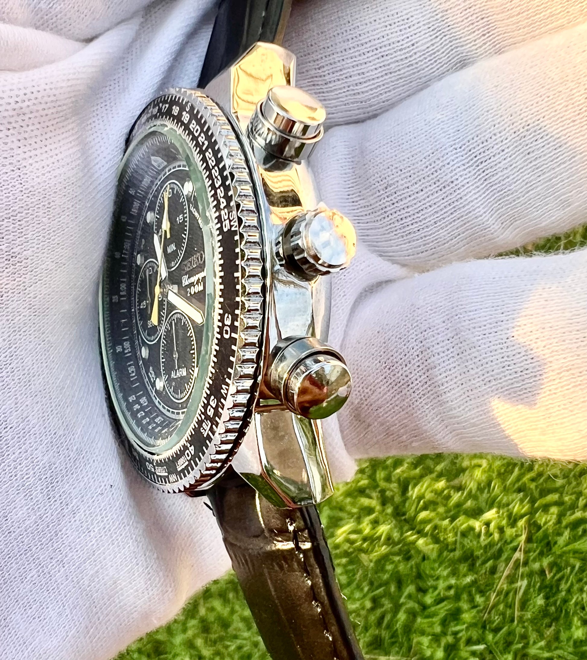 Seiko Chronograph Speedtimer 43mm Quartz Movement Black Dial Bezel Leather Watch